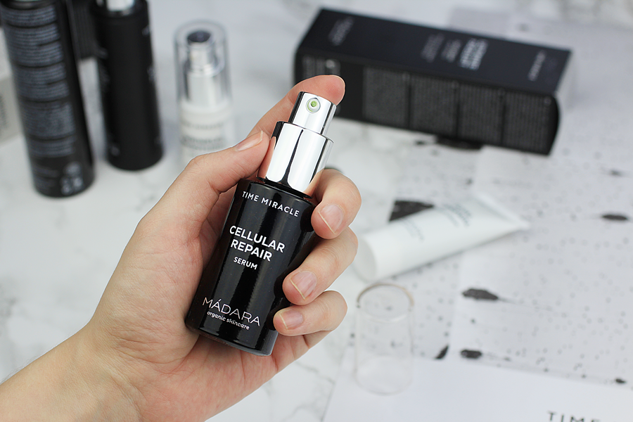 A Mádara Time Miracle termékcsalád szérumja első ránézésre is csodás látványt nyújt gyönyörű fekete-ezüst csomagolásával.