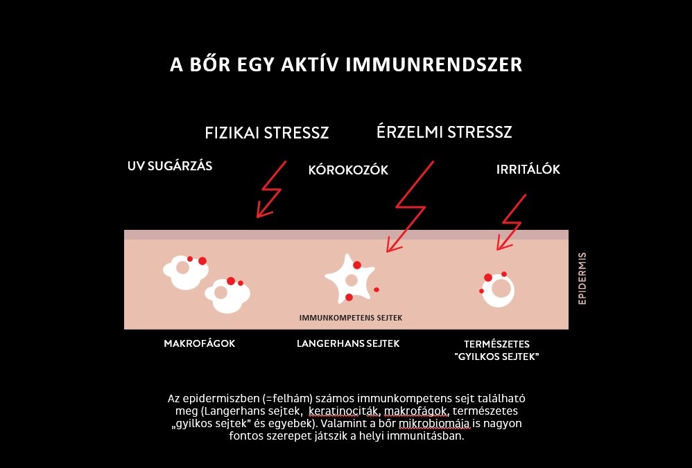 A bőr immunrendszerének 2 legfőbb eleme a felhám (epidermisz) és az irha (dermisz), amelyek számos kulcsfontosságú sejtet tartalmaznak. Úgy gondoljunk rá, mint egy szilárd várra, aminek a kőfalait non stop katonák védelmezik. Ezeket a katonákat nevezzük Langerhans sejteknek, amelyek az immunrendszerhez tartozó antigén prezentáló sejtek, ezek a bőr és nyálkahártya szöveteiben felismerik a kórokozó mikroorganizmusokat, bekebelezik őket és feldolgozott antigénjeiket prezentálják a felületükön. A dermiszben található keratinocytáknak is fontos szerepe van a védekezésben; észlelik az idegen behatolókat és figyelmeztetik a többi sejtet a védekezésre. A többi speciális, az immunrendszerben résztvevő sejt, a különféle dendritikus sejtek, makrofágok és limfociták. Tehát ezek a sejtek egy olyam komplex rendszer részei, ami folyamatos mozgásban van és soha nem áll le. A folyamatos működés alatt fenntartja a bőr egyensúlyát, védekezik a fertőzések ellen és folyamatosan megújítja a bőrünket.
