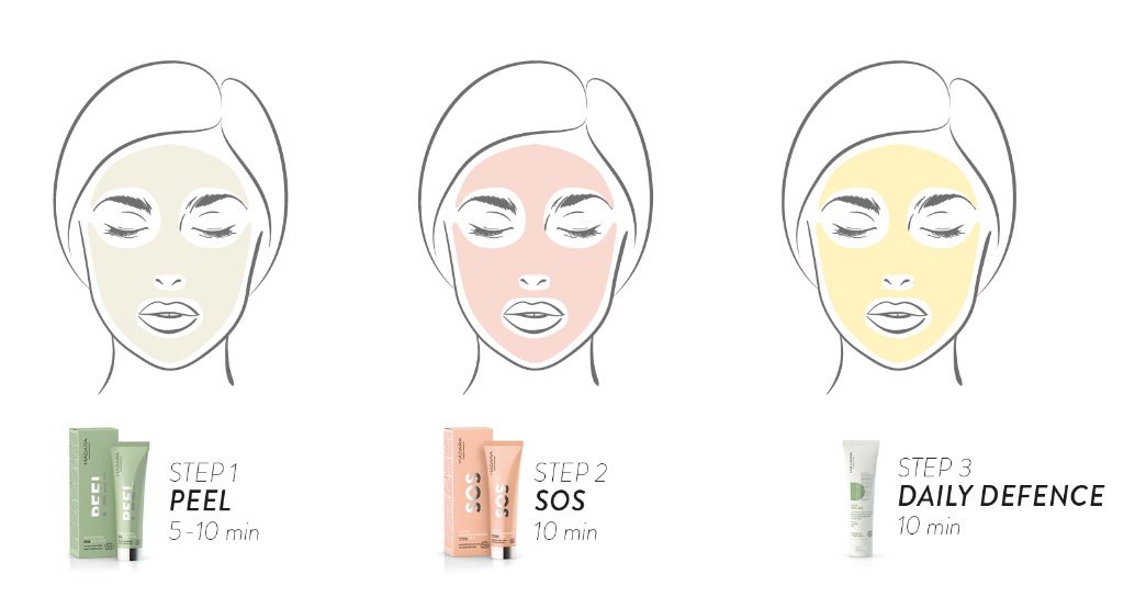Arctisztítás után a szokásos módon vidd fel a hámlasztó AHA maszkot, ami természetes AHA-gyümölcssavakkal kezdi meg a munkát. 10 perc után öblítsd le.
