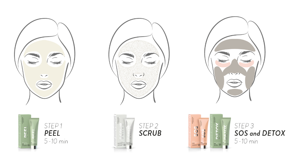 Most válaszd külön a két maszkot. A T-vonalra, a homlokra, az orra és az álladra vidd fel a DETOX iszappakolást. Az arcod többi részét pedig borítsd jótékony és hidratáló bazsarózsagyökér-kivonattal, az SOS hidratáló arcmaszk segítségével.
