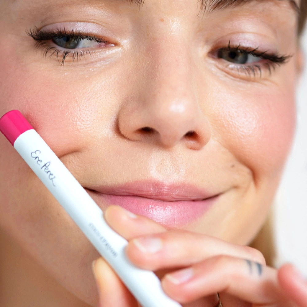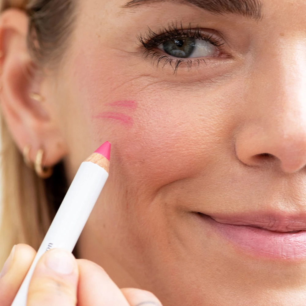 A legszebb eredményért mindig legyen kihegyezett a ceruza! Először rajzold meg az ajkad kontúrját, majd töltsd ki az egész területét! A gyűrűsujjad segítségével ütögesd fel az orcádra! Kérlek, vedd figyelembe, hogy az újrahasznosított kupak miatt az első alkalommal picit nehezebb kinyitni a ceruzát!