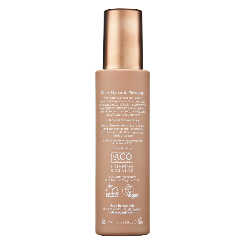 A fenntarthatósági szempontokat is figyelembevéve, az üvepalackban rejlő INIKA Organic természetes önbarnító permet építhető arany fényt kölcsönöz akár a legvilágosabb bőrtónusnak is! A 100%-ban természetes DHA-nak köszönhetően a színárnyalat 10 óra alatt teljesen kifejlődik, majd újra felvihető a sötétebb árnyalat kialakításának érdekében.