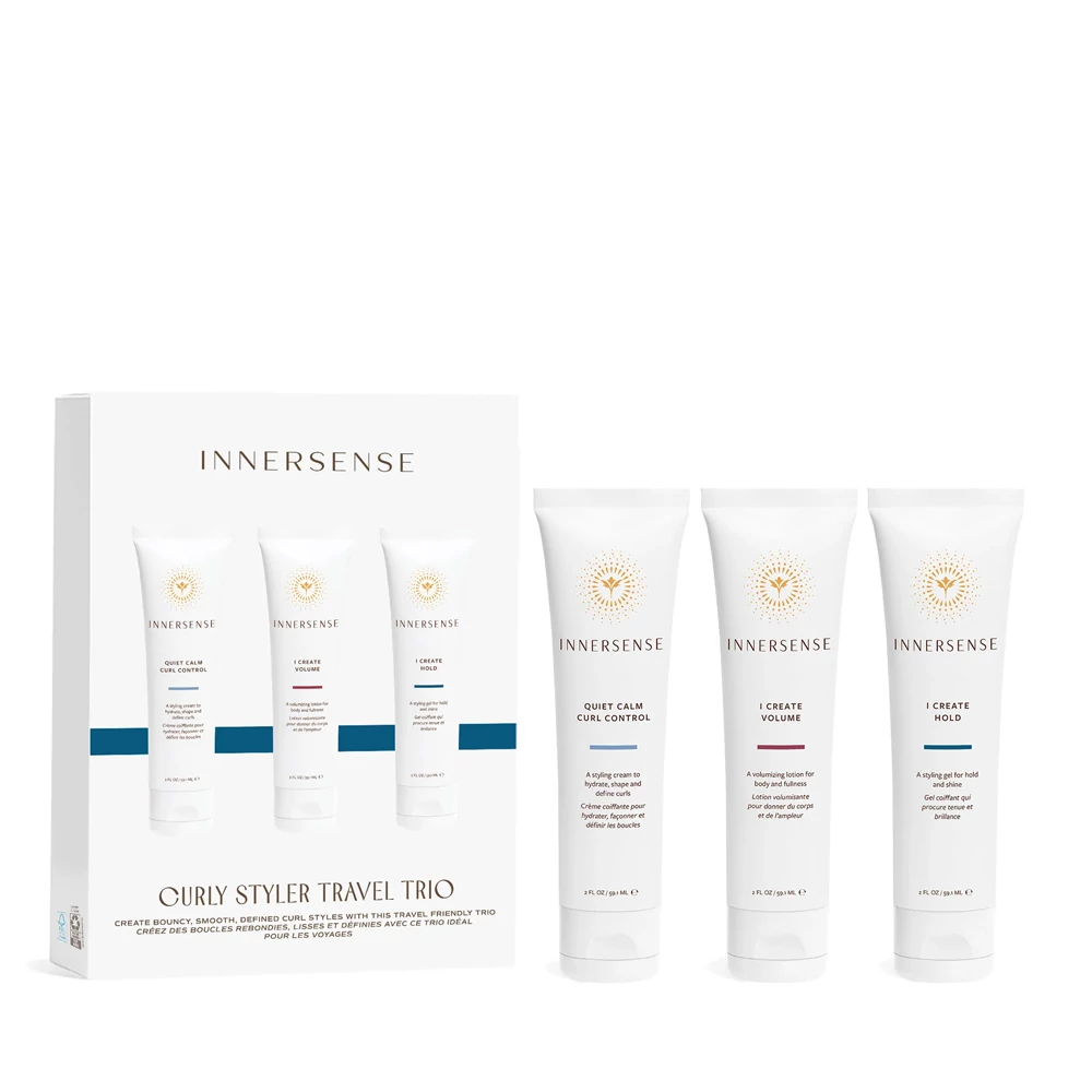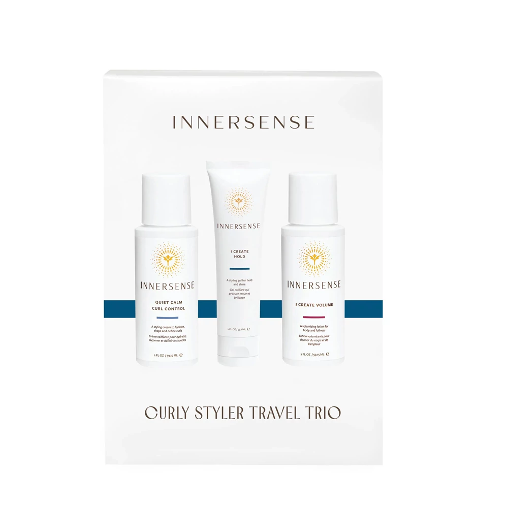 Az Innersense Organic Beauty Curly Styler Travel Trio biztosítja a fürtök kívánt tartását utazás közben. Míg az aloe és méz alapú I Create Hold hajformázó gél határozott fürtöket, sima kontyokat és strukturált fazonokat hoz létre, az I Create Volume hajformázó lotion közepes tartást és volument kölcsönöz a hajnak. A Quiet Calm Curl Control hajformázó krém simává és határozottabbá teszi a hajat. Ápoló hatásának köszönhetően a fürtöket is fényessé varázsolja.