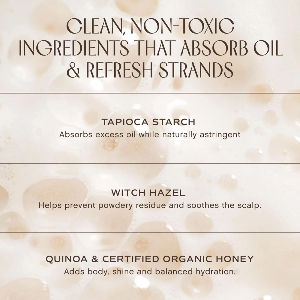 Habzó porrá alakuló formulája tápiókakeményítőt használ a felesleges olaj felszívására, míg a természetesen összehúzó hatású varázsmogyoró segít megelőzni a púderes maradványokat és megnyugtatja a fejbőrt. A hajápoló quinoa és a tanúsított bio méz dús, fényes és kiegyensúlyozott hidratáltságot biztosít a hajnak. Ideális minden hajtípusra és textúrára.