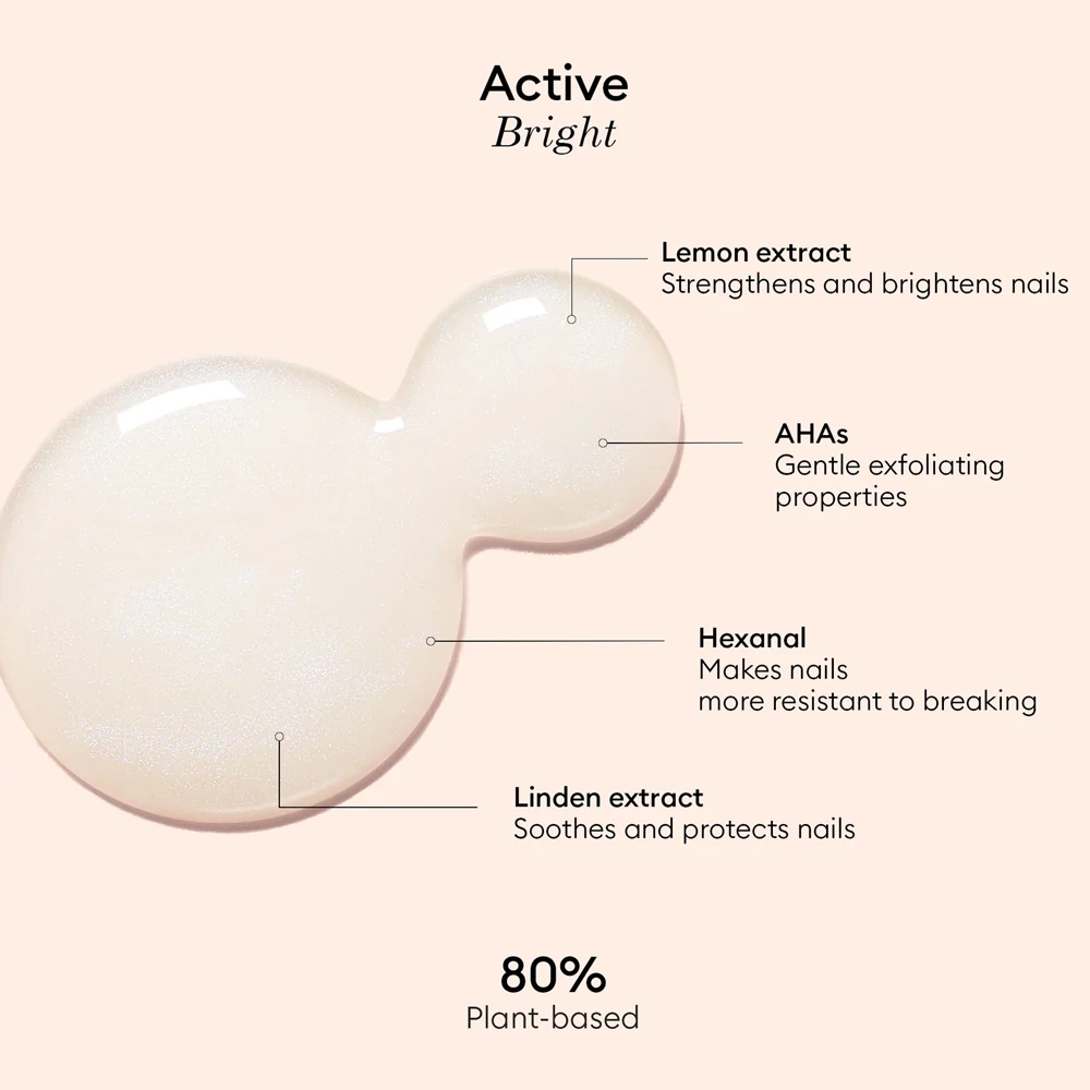 Csillogó, ultrafényes formulája fényesítő tulajdonságaikról híres citromkivonatokat, hidratáló tulajdonságokkal rendelkező hársfakivonatot és hexánált tartalmaz, amely különösen hatékony a legyengült körmök keményedésében és helyreállításában. A formula enyhe kék csillogása semlegesíti a köröm sárga aláfestését. Az azonnali "tiszta köröm" hatás garantált! Erőteljes zöld koktél az azonnali ragyogó körmökért: