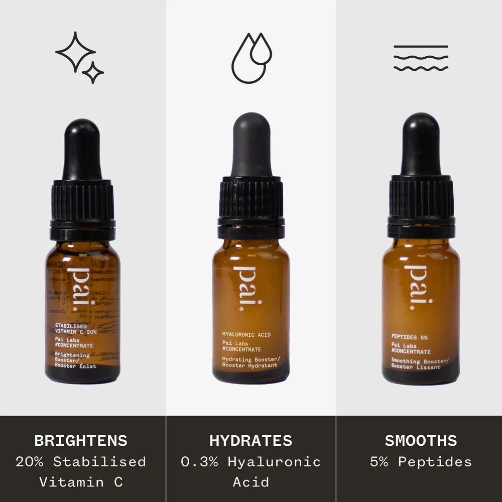 A PAI LABS kezdőszettje a három legkedveltebb hatóanyagot tartalmazza a rutinod tökéletesítéséhez – a világosabb, simább, hidratáltabb bőrért! Használd ezeket a booster szérumokat akkor és amikor a bőrödnek szüksége van rá, csepegtesd bele a meglévő hidratálódba, mindenféle irritációtól való félelem nélkül.