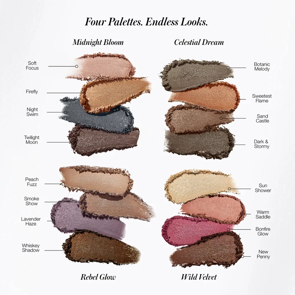 Egy tiszta, talkummentes szemhéjpúder-paletta, amely négy gazdagon pigmentált, különböző finissel – matt, szatén és metál – rendelkező árnyalatot tartalmaz a végtelenül látványos sminkekhez. Négy játékos színvilágban érhető el, mindegyik egy-egy gondosan összeállított, ikonikus négyes, amelyet maga Rose-Marie harmonizált tökéletesen. Többdimenziós, tartós szemhéjpúderek, melyek selymesen puha textúrát biztosítanak, könnyedén siklanak a bőrön, egyszerűen eldolgozhatóak és rétegezhetőek, miközben nem hullik le a por.
