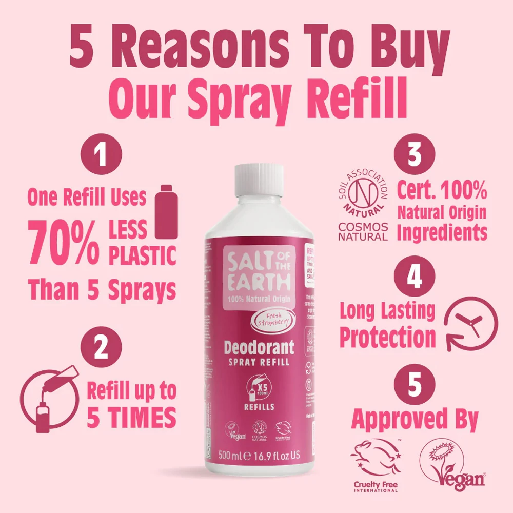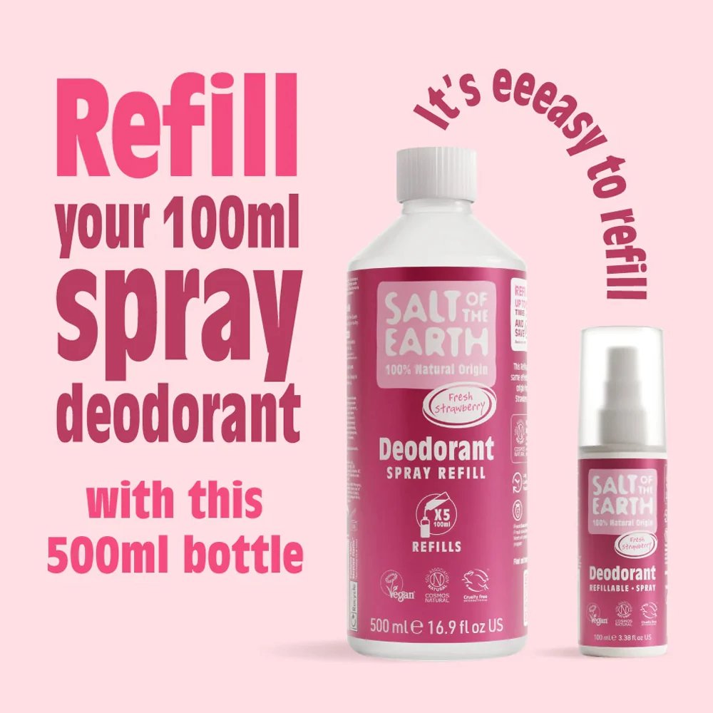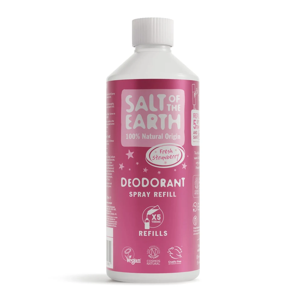 Ezzel a környezetbarát 500 ml-es utántöltővel 5 alkalommal tudod újra tölteni a kedvenc Salt of The Earth Édes eper dezodor spraydet. Egyetlen újra töltéssel 60%-al kevesebb műanyagot használsz, mintha 5 alkalommal megvennéd a 100 ml-es kiszerelést. Az utazó kiszerelésű spray utántöltésére is alkalmas.