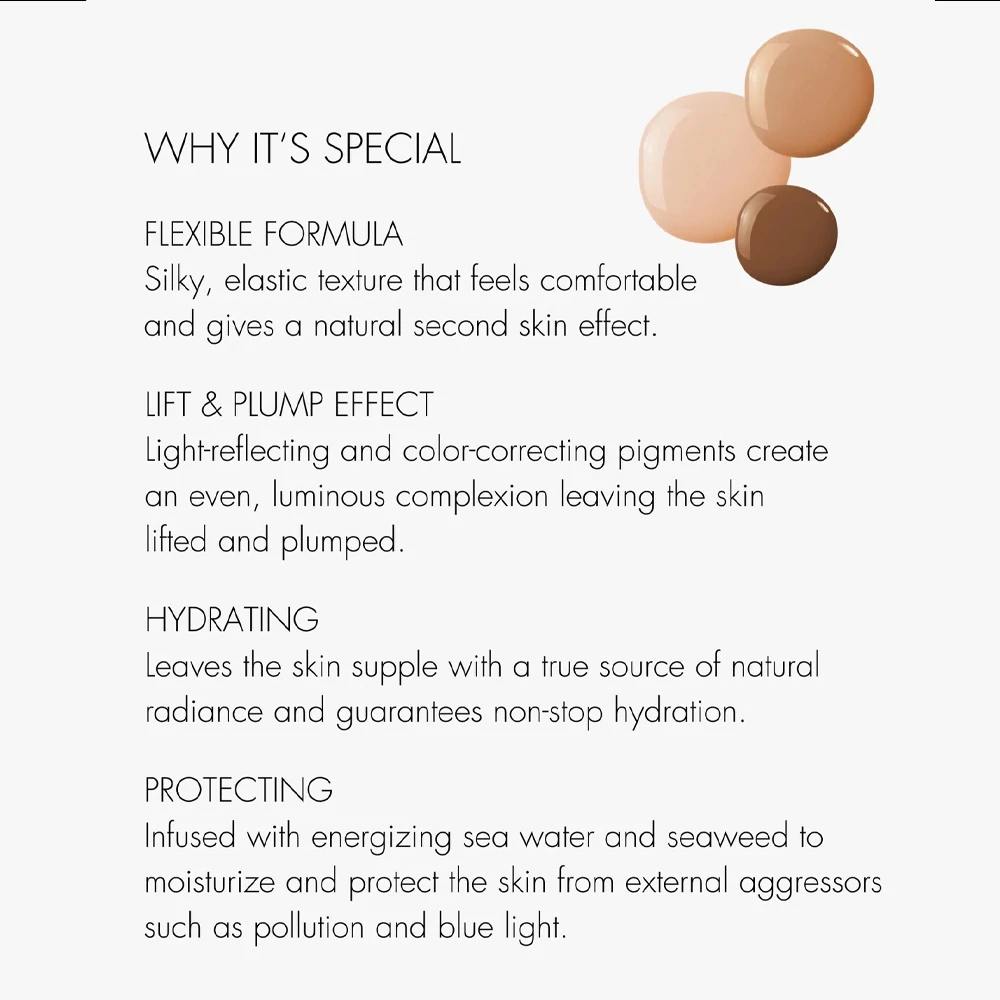 Energetizáló tengervízzel és hínárral átitatva, hogy hidratálja és megvédje a bőrt a külső agresszoroktól, például a szennyezéstől és a kék fénytől. 15 árnyalatban kapható.
