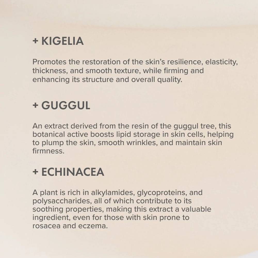 Kigelia: Az afrikai kolbászfa terméséből kivont Kigelia kivételes feszesítő khatású. Klinikailag bizonyítottan akár 50-70%-kal növeli a bőr feszességét és rugalmasságát.